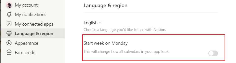 영어 외 해당 메뉴에서는 노션 표에서 한주의 시작을 월요일로 하는 설정도 가능하다.