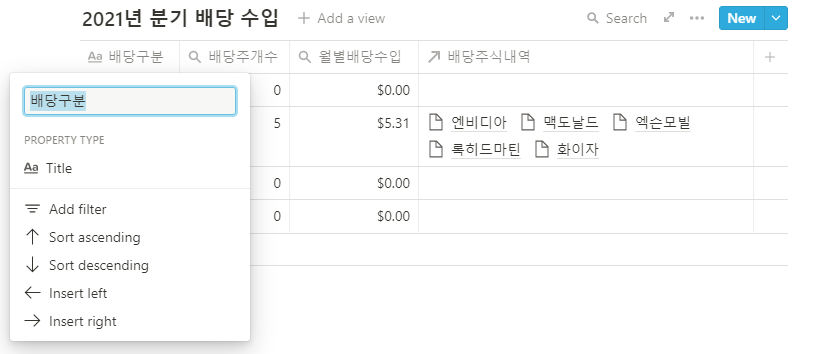 - 배당월 : 해당 월에 해당하는 총금액을 구하기 위해 입력이 필요하다. (배 당월 별 수입의 배 당월 필드와 연동된다.)
