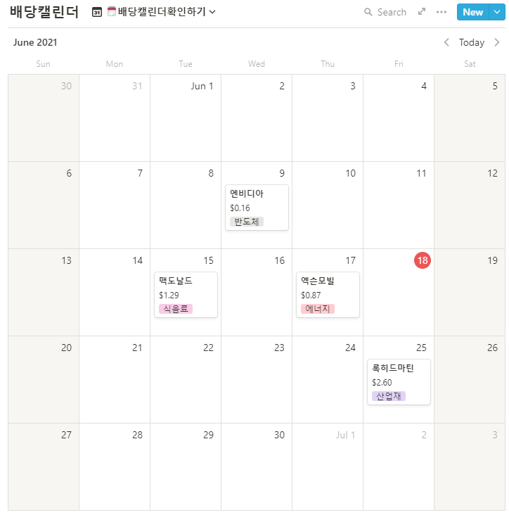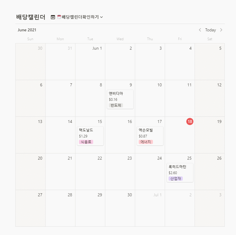 캘린더 뷰로 확인하면 주식 이름과 배당금액, 그리고 해당 주식이 어떤 타입인지를 확인할 수 있다.