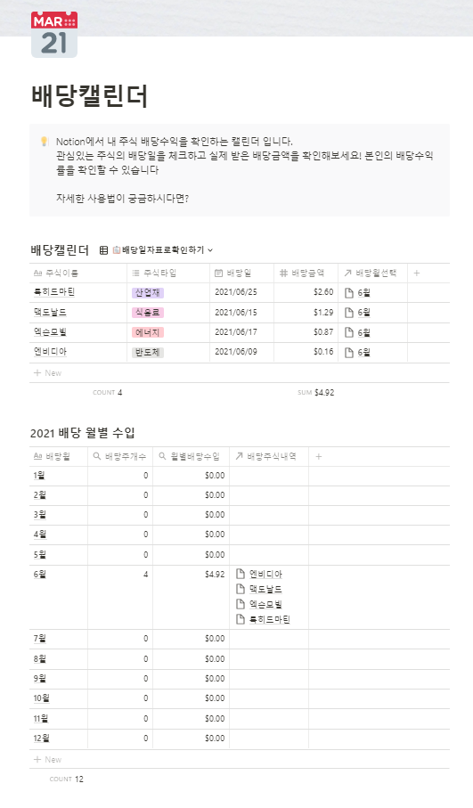 실제 배당을 받는 내용을 적는 배당 캘린더와 해당 내용으로 월별 수입을 계산해주는 표가 있다.