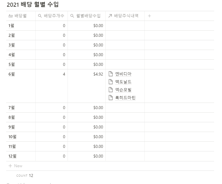 매달 배당 수입이 얼마나는지를 정리할 수 있는 노션 캘린더를 만들어보았다.