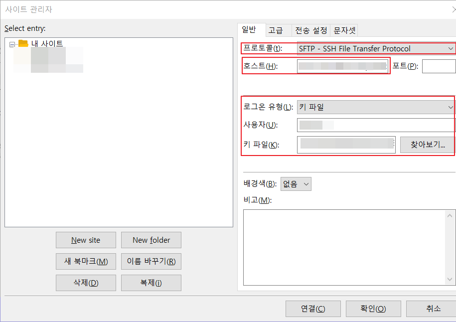 - 프로토콜 : SFTP-SSH File Transfer Protocol 선택