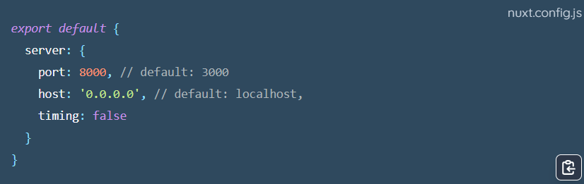 nuxt.config.js 속성 내 server에 포트와 host를 작성해주면 된다는 글을 발견하고 바로 적용해보았는데,