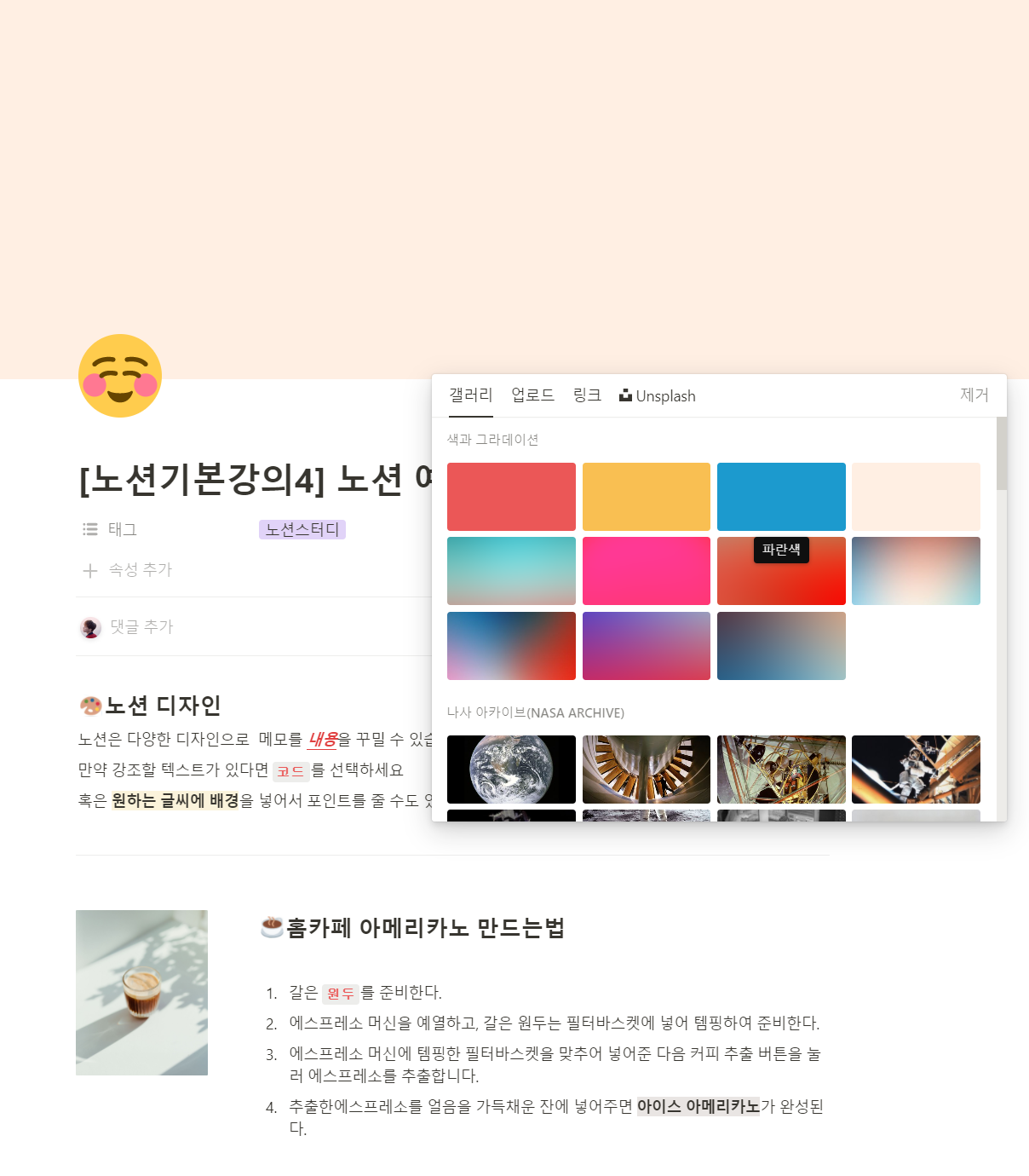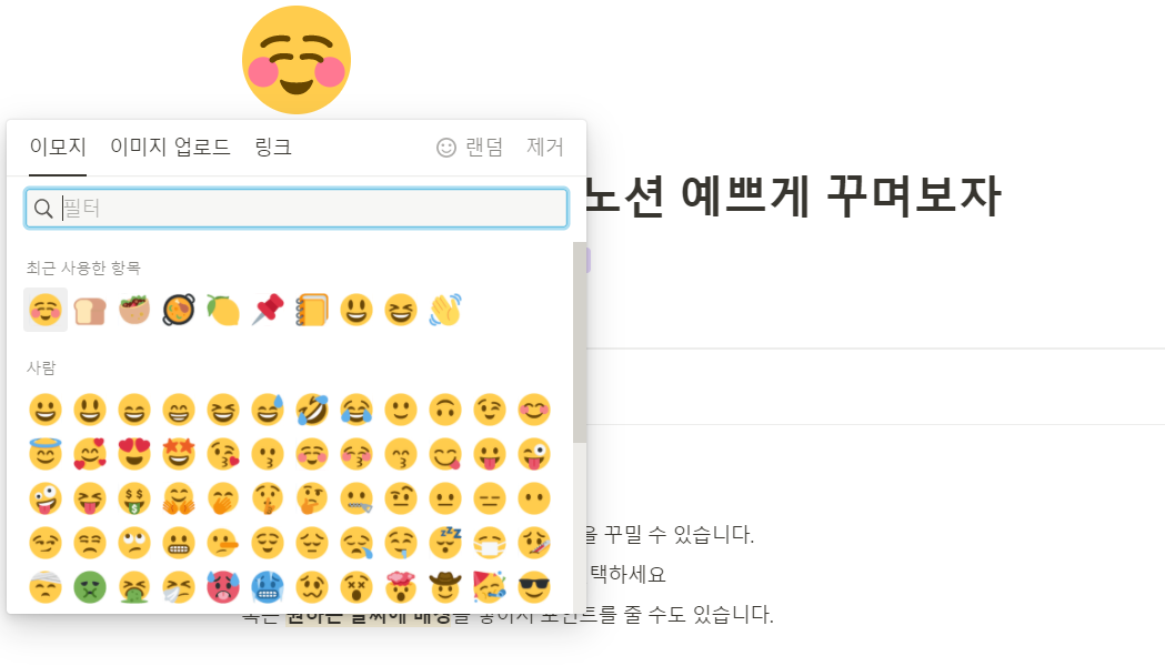 이런 식으로 노션에 어울리는 이모지, 배경까지 선택하면