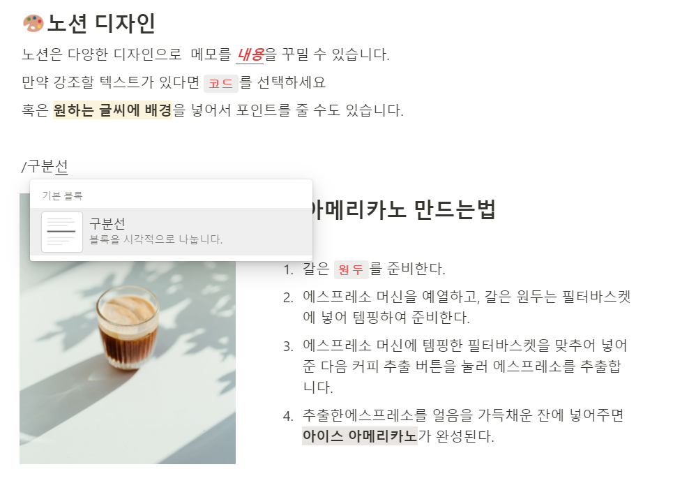 이미지, 이모지, 색상, 코드, 색상 배경 등 노션에서 제공하는 다양한 블록 꾸미기를 통해서